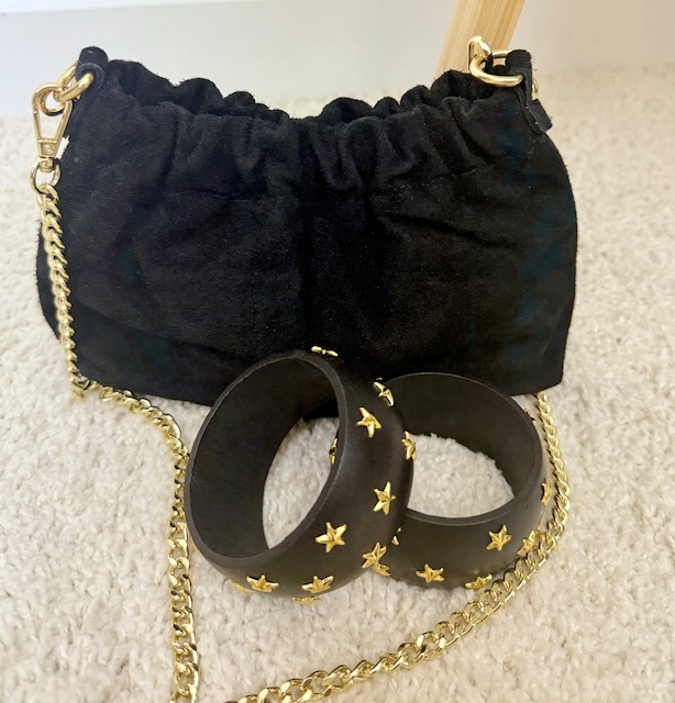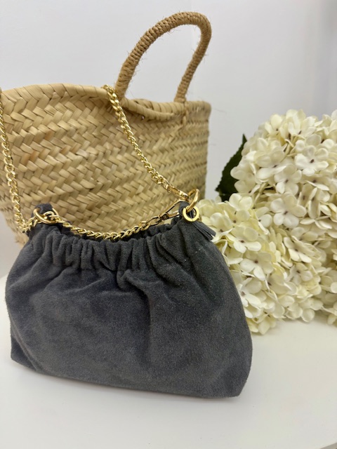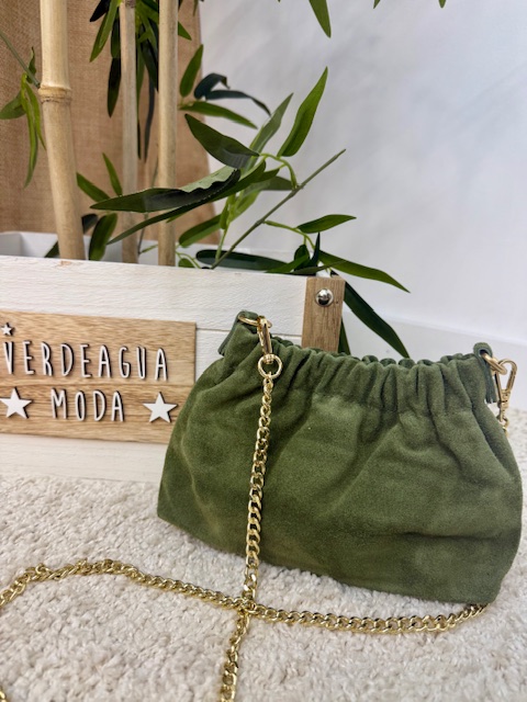 Bolsito ideal de piel de ante. bierre de clip y cadera dorada larga. Pudes llevarlo también como cartera de mano