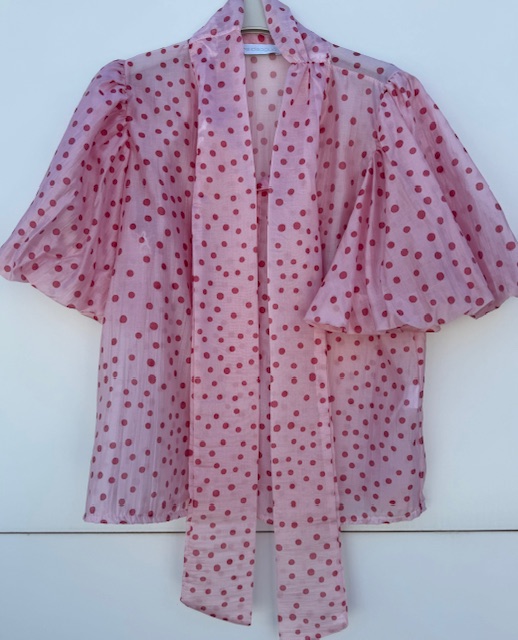 Camisa de tejido similar a la seda (tencel), de tacto increible, semitransparente. Estampado de lunares y man gas cortas abullonadas. Cerrada con botones y lazada.