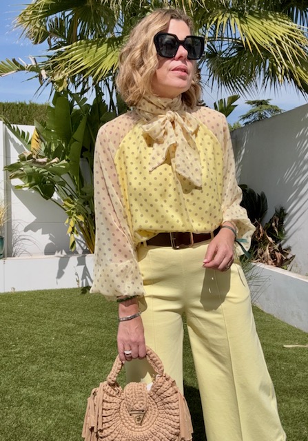 Camisa de gasa, de estampado de pequeños lunares, con cinta al cuello. Diseño de blusa romántica, de tejido semitransparente, con la parte de pecho y espalda con forro. Mangas terminadas con goma, abullonadas.