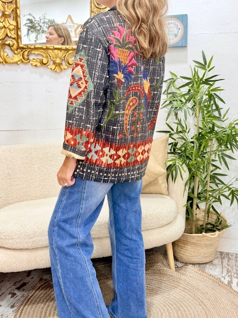 Preciosa americana de tejido similar a la antelina, con elastane. Con un solo botón, estampado precioso, de fondo en color marino, donde predominán las tonalidades caldera de sus motivos etnicos.
