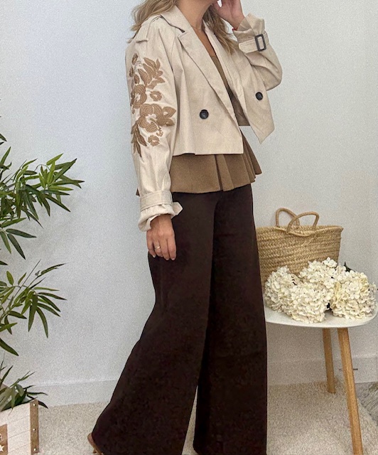 Chaqueta cruada de efecto gabardina, forrada por su interior. Mangas preciosas bordadas en tono camel.