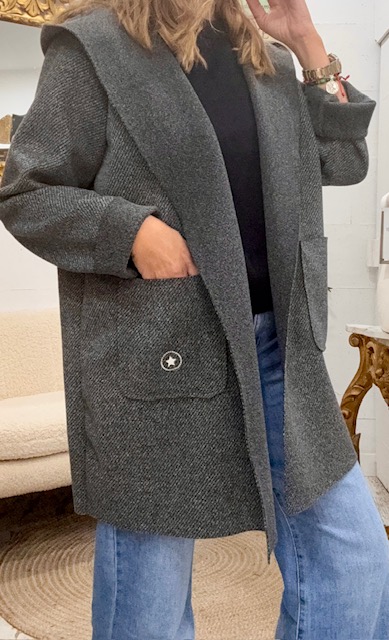 Chaqueta de pañete, totalmente abierta, con bolsillos cuadrados planos a cada lado. Bordado de nuestra estrella en uno de llos. Mangas largas.