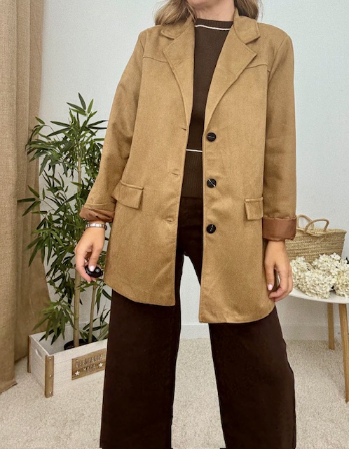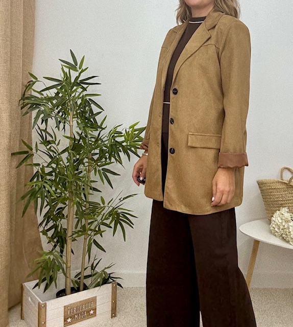 Blazer de tejido de antelina, con solapa y botones. Este modelo de americana lleva hombreras, los bolsillos son simulados. Color tostado.