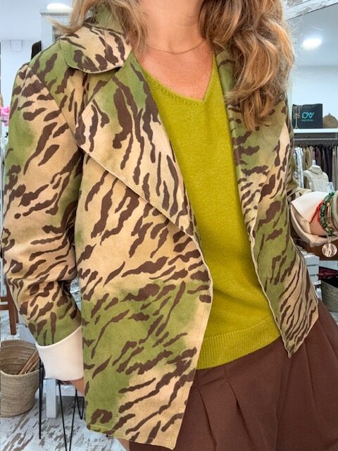 Cazadora de solapas, sin cremallera ni botones, de un estampado muy original en animal print. Diferentes combinaciones de colores para esta chaqueta corta, de tejido antelina.