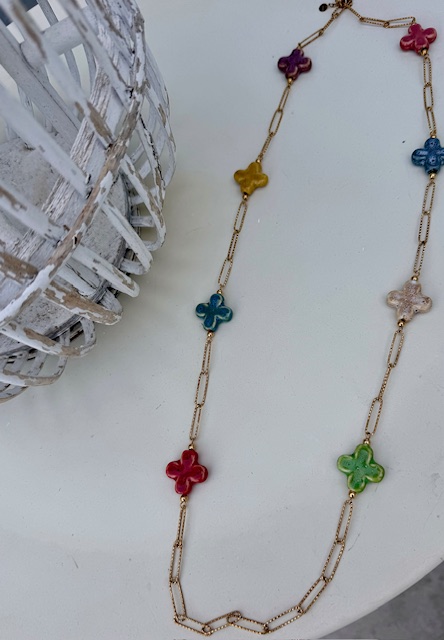 Collar de acero de cadena de eslavones, largo. Con aplicaciones de piedra en forma de cruces de diferentes colores. Ideal para cualquiera de tus looks.
