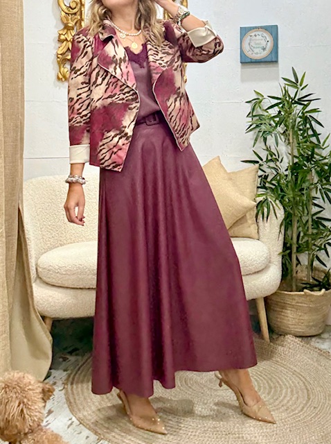 Falda de ecopiel, simulando cuero. Color guinda de tonalidad fresón, con cinturón. Es una falda de vuelo, larga sin bolsillos, muy combinable.