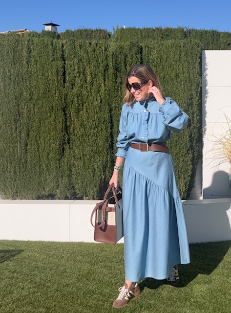 Falda de vuelo, de tejido vaquero fino. Con cintura engomada, sin bolsillo. No tiene cremallera ni botones. Largo midi: