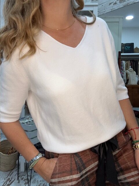 Jersey de manga corta, casi al codo, y escote en pico.