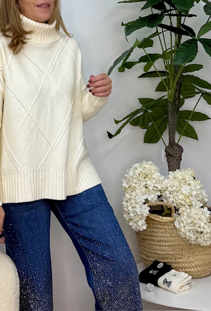 Jersey de cuello vuelto y manga larga. Un poco más corto por la parte delantera. Estampado haciendo rombos del mismo punto y color.