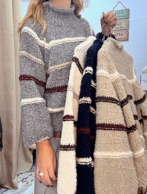 Jersey de punto gordito, tejido con franjas de varios colores ideales. Mangas terminadas sin puño, semi largas