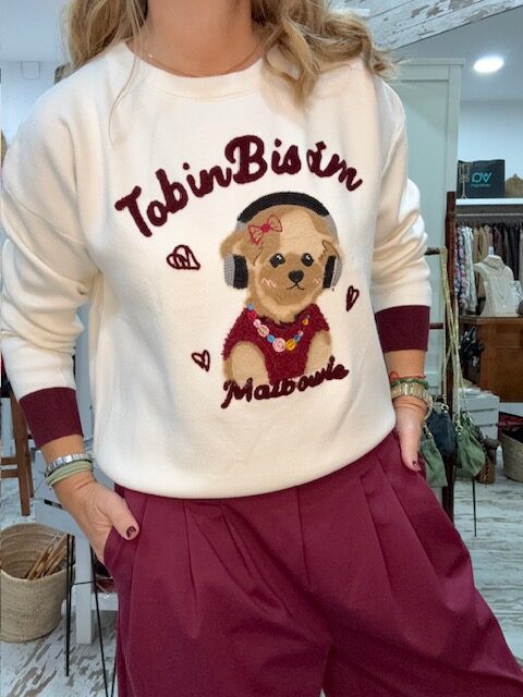 Jersey precioso de punto liso, con pecho decorado con letras en punto y figura de oso.Cuello redondo y mangas largas, destacando de ellas la terminación en distinta tonalidad que el resto del suéter.