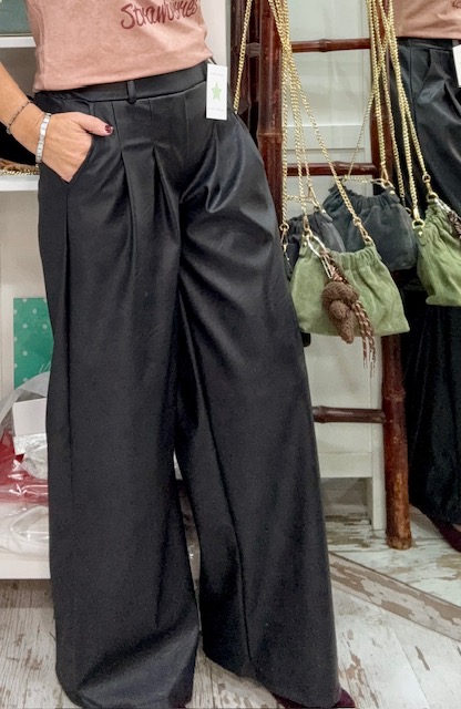 Pantalón en cuero vegano, color negro, con pinzas y bolsillos. Cinturón marrón incorporado.