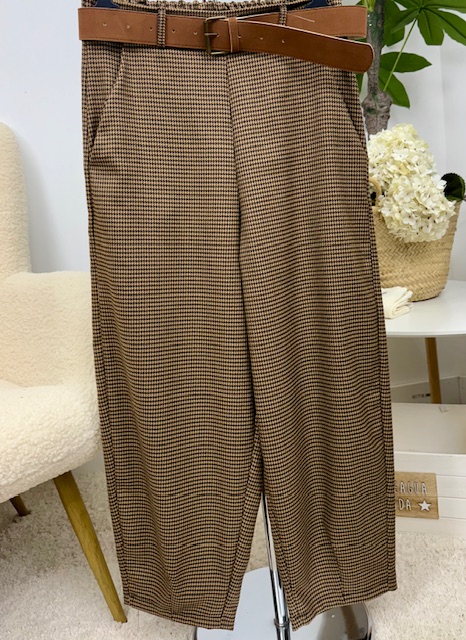 Pantalón bombacho, con pinzas en ambos bajos. Con bolsillos y cinturón en color marrón. Estampado a modo de pata de gallo en dos tonalidades de marrones.