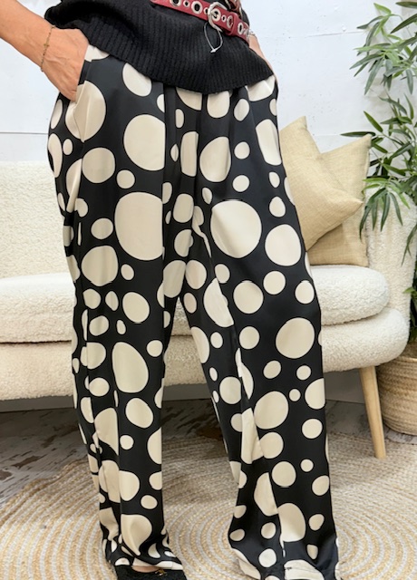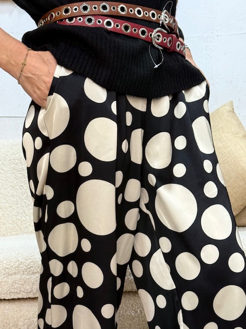Pantalón ancho, de cintura engomada y tejido satinado. Estampado de lunares de diferentes tamaños en color crema. Fondo del pabtalón en color negro. Tiene bolsillos.