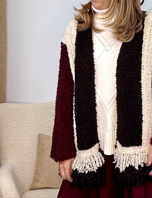 Chaqueta de punto gordo, totalmente abierta, terminada en desflecado por todo su contorno bajo. Tricolor.