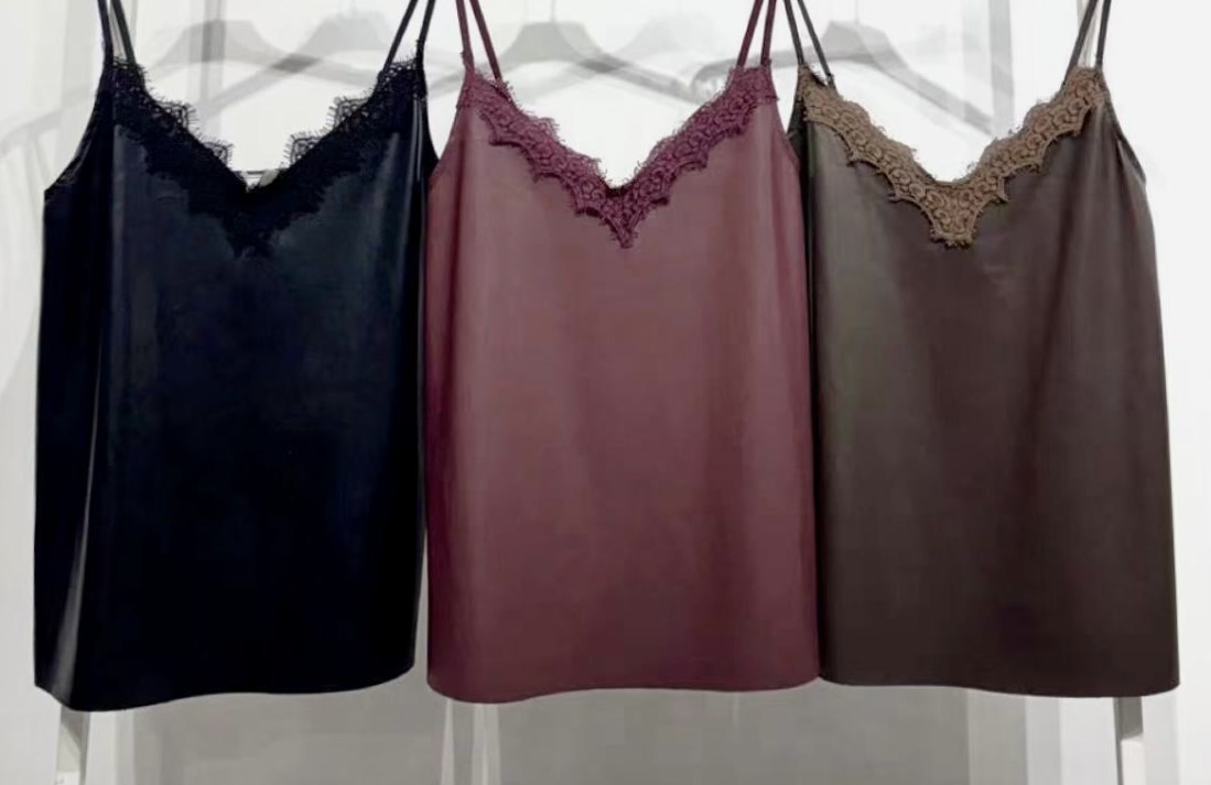 Top de tirante con encaje. Tejido similar al cuero. Flexible y elástico. Tirantes regulables.