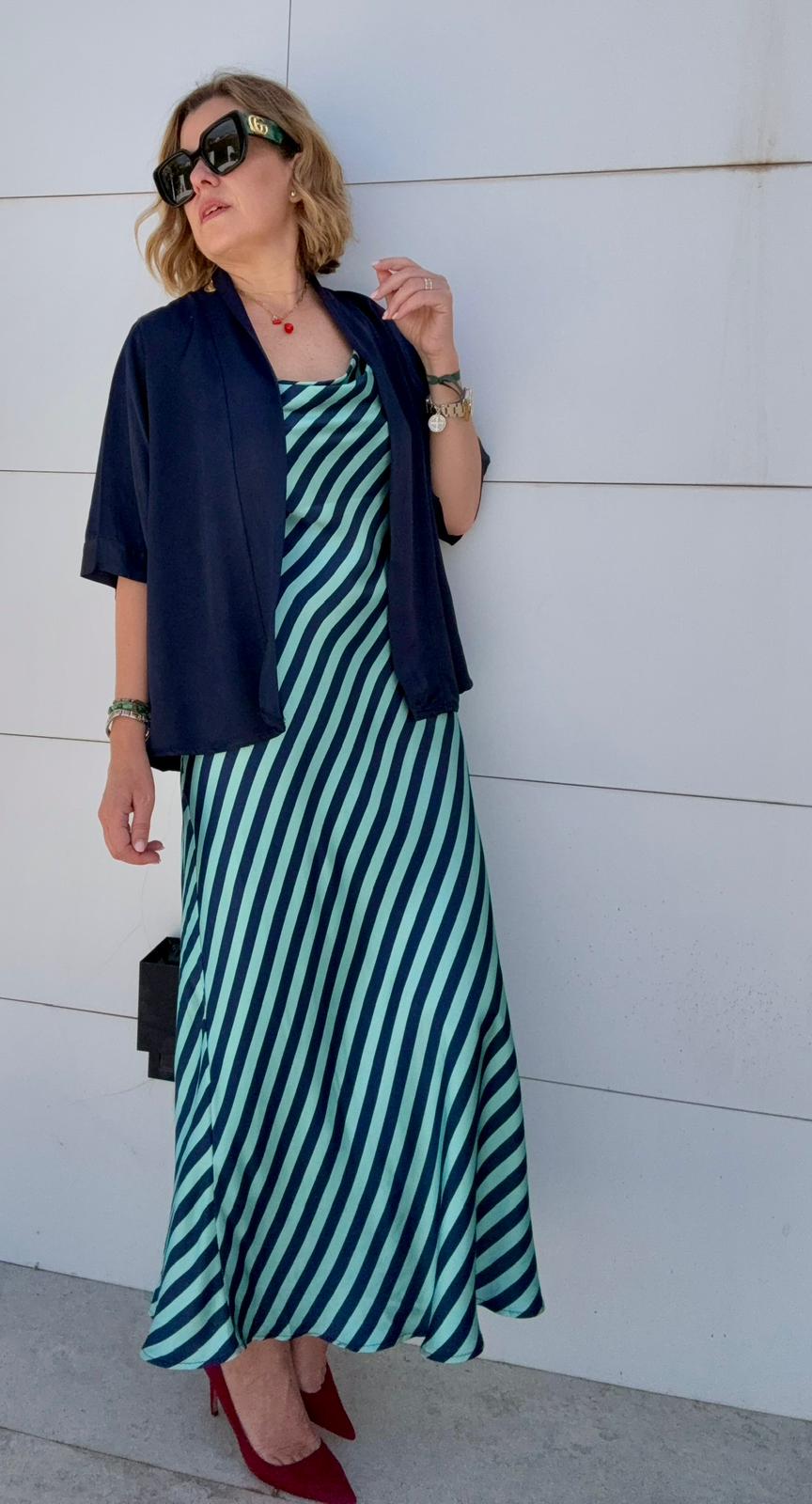 Vestido de tejido satinado, bicolor en tonalidad verdeagua y marino. De tirantes, con goma trasera en la parte alta de la espalda. Largo midi, estatura foto de 1,67 cm.